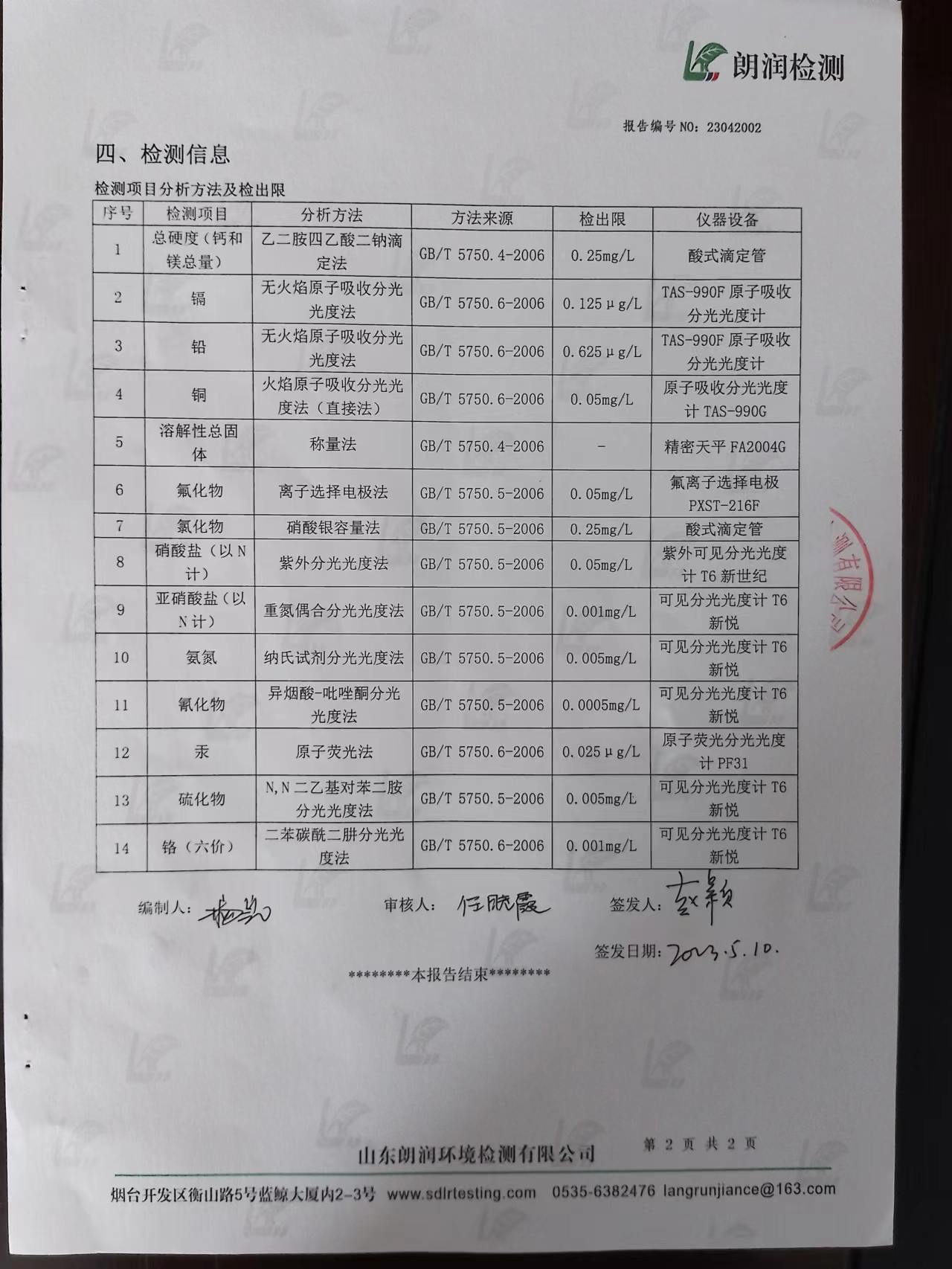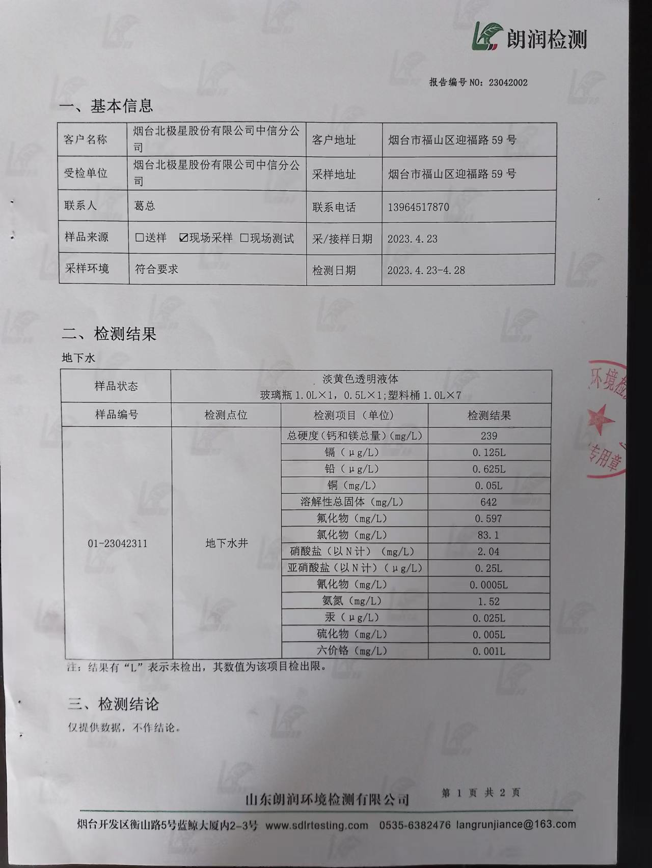 煙臺北極星工業(yè)園地下水檢測報(bào)告2023年5月